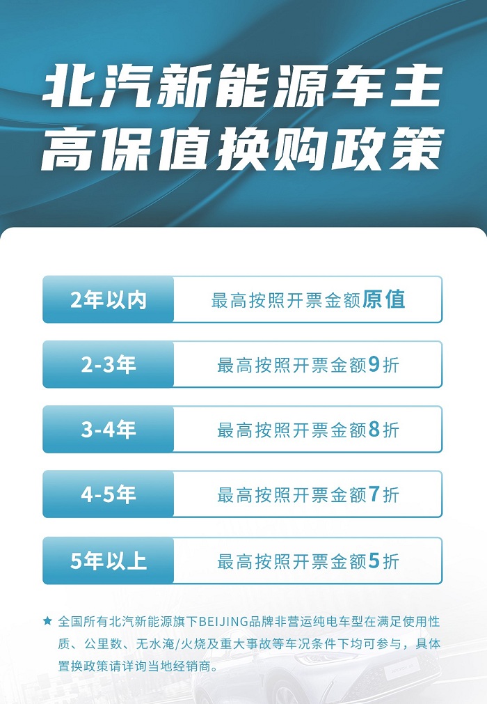 对此,北汽新能源展现出了“国企”风范,践行“以用户为中心”,特别推出了“高保值换购”行动。购车2年内的北汽新能源老用户可享受最高按照开票金额原值换购,相当于“免费”开2年后直接升级换新车。购买超过2年的旧车,换购补贴力度同样远超行业水平,可根据不同车型、年限、里程、车况等对应享受最高9折、8折、7折、5折等梯次丰富的高额置换政策,以远超燃油车的“保值率”进一步降低用户换购成本,树立业界新标杆。也与如今降价频繁的国内车市形成鲜明对比,让车主换购时更安心。