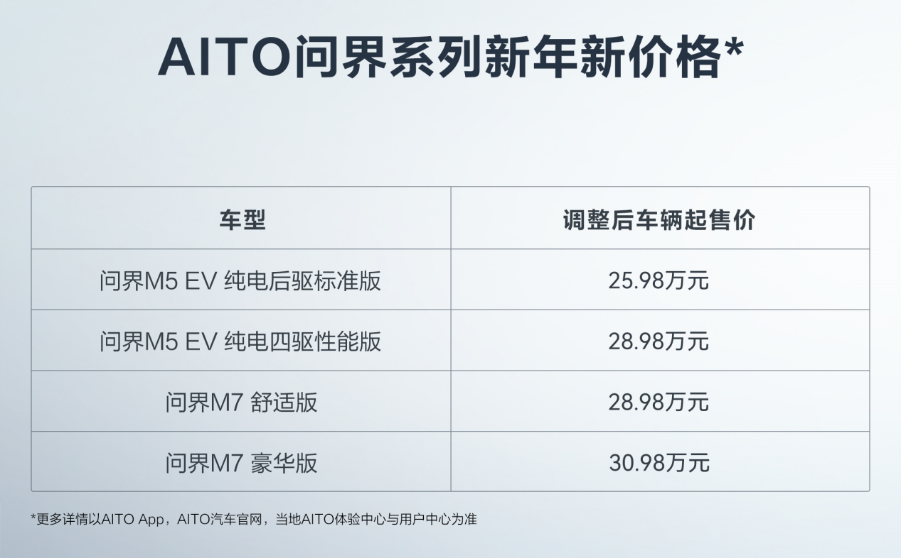 1月13日,赛力斯AITO问界系列车型官宣调价。根据信息显示,AITO问界M5 EV纯电版起售价调整为25.98万元,AITO问界M7的起售价则调整为28.98万元,降价幅度最高达3万元!针对已提车的车主,AITO问界M5 EV纯电版和AITO问界M7的首任车主可享受总价值2.3万-3.5万元的权益,包括延保、AITO积分在内的诸多权益!此外,尽管此次问界M5全系并未进行价格调整,但老用户仍可享受2年基础保养。